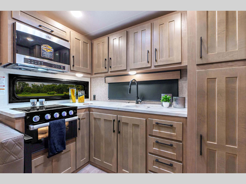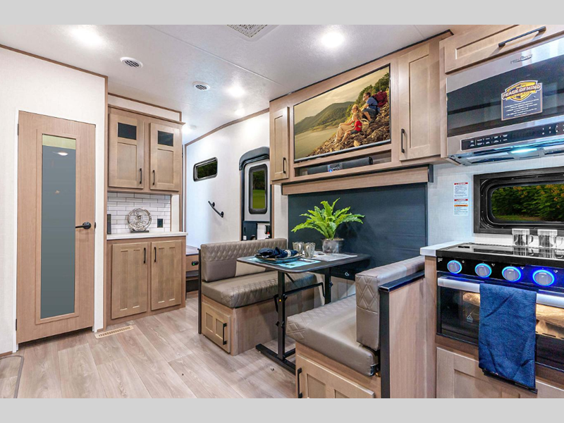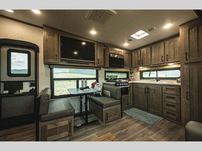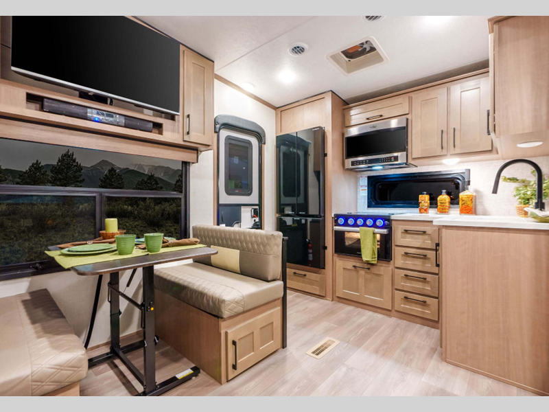 Each model is constructed with durable Tufflex roofing material, a steel powder coated frame, and a Lamilux gelcoat fiberglass. You will appreciate the All Weather Insulation Package that features a fully heated, insulated, and enclosed underbelly, and the RV airflow A/C system optimizes the airflow in your A/C by increasing airflow by an average of 40% for a smoother running A/C without all the extra noise. The exterior graphics are sure to turn heads as you travel down the highway, and the new cabinetry will have you feeling right at home. There are a variety of floorplans to choose from, all weighing under 12,000 lbs. for lightweight towing!