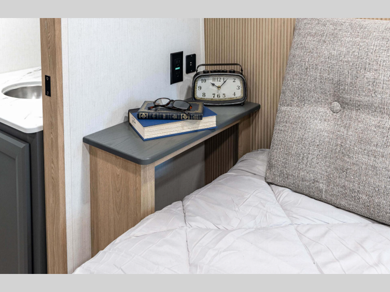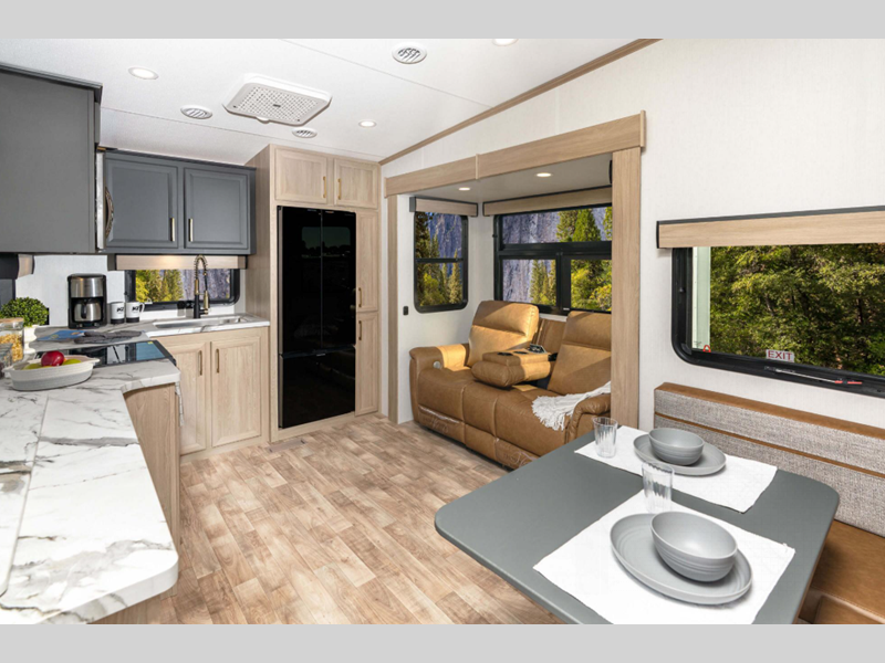 Each fifth wheel is constructed with a steel powder coated I-beam frame, a Lamilux gelcoat fiberglass exterior, fully insulated slide rooms, and durable Tufflex roofing material so you can enjoy making memories for years to come. You'll love the large ceiling crown molding inside, along with seamless countertops, night roller shades, and Beauflor flooring in the slide outs to name a few comforts. The RV Airflow A/C is 40% more efficient and the KZ Engage powered by OneControl lets you easily control your fifth wheel's functions at the touch of a button!